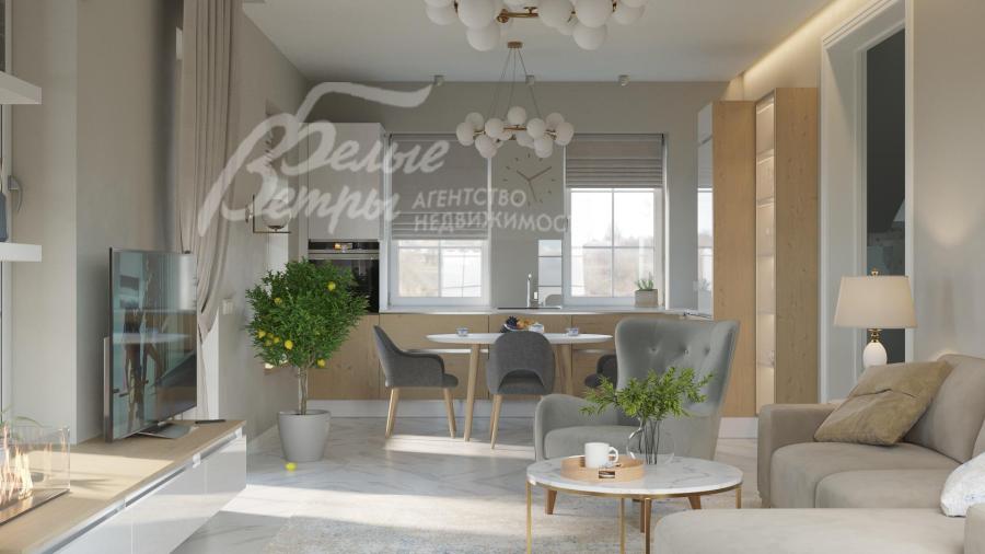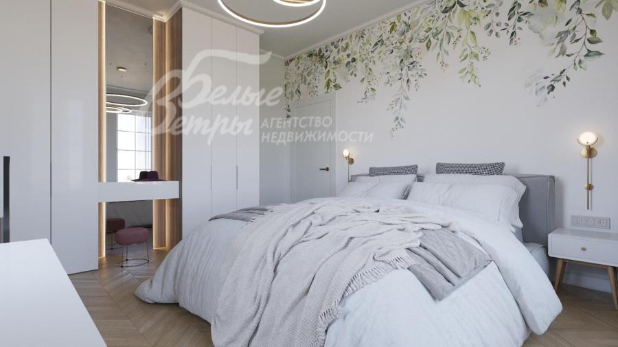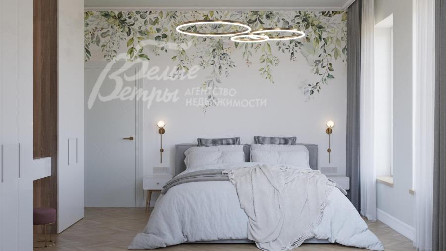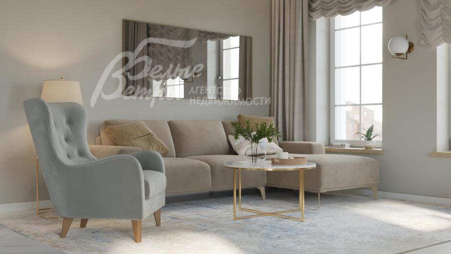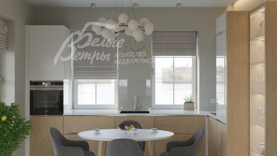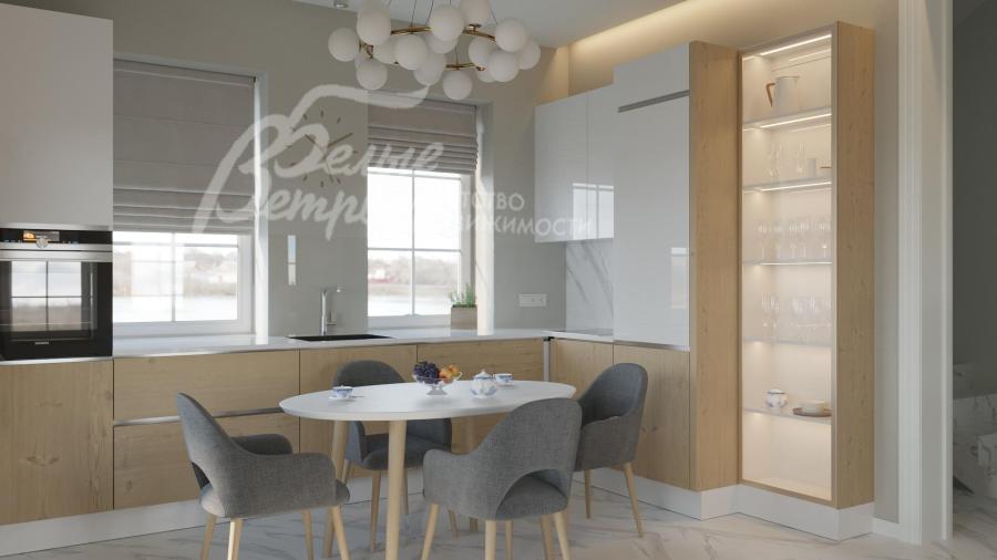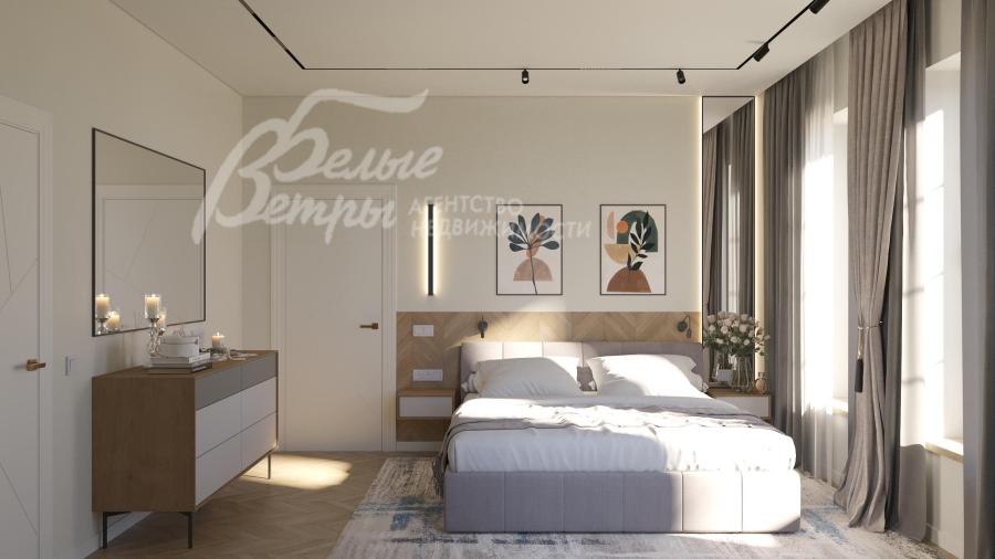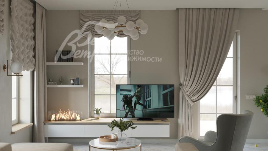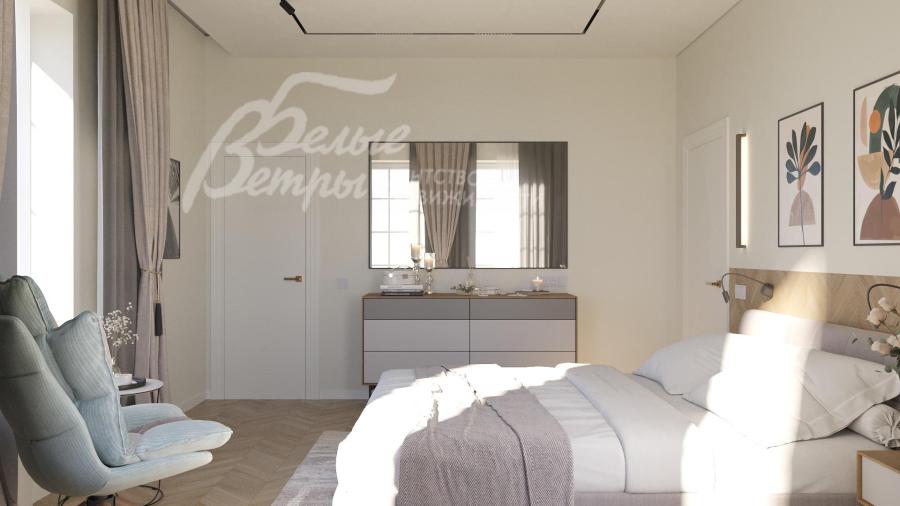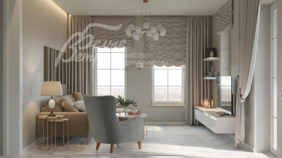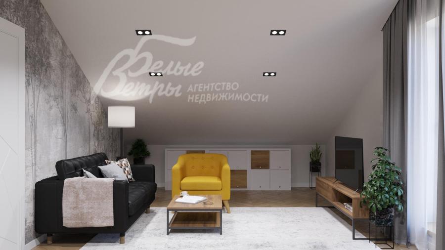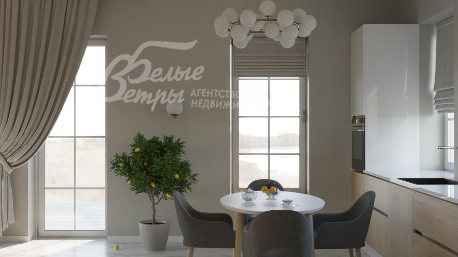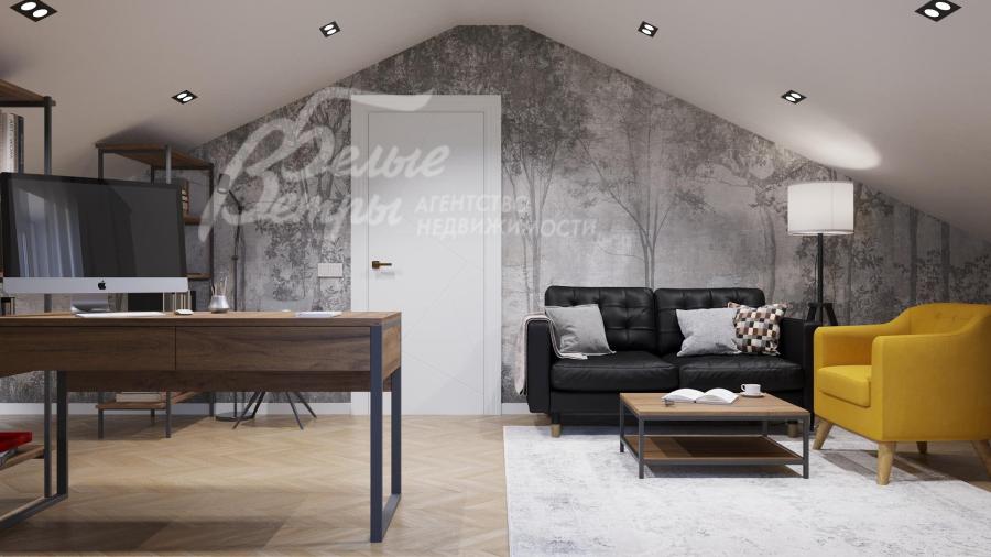 Описание внутренней отделки: в доме выполнена современная отделка в стиле неоклассики по комплексному дизайн‑проекту, включающему расстановку мебели. Стены в жилых помещениях оформлены интерьерной краской и дизайнерскими обоями, в санузлах – плитка, мозаика и интерьерная краска. На полу в кухне-гостиной уложен керамогранит Kerama Marazzi «Монте Тиберио обрезной» с системой водяного подогрева, в спальнях и кабинете – кварц‑виниловое покрытие с рисунком «французская ёлка», имитирующее дерево, также с водяным подогревом, в санузлах смонтирован керамогранит, оснащённый водяным подогревом. Потолки – подвесные из гипсокартонных листов (ГКЛ) с нишами для скрытых карнизов и встраиваемого освещения, дополненные разнообразной подсветкой, создающей многоуровневый световой сценарий. Установлено электрооборудование: розетки и выключатели серии Schneider Electric Atlas Design. Интерьер дополнен межкомнатными ламинированными дверьми модели Estet белого цвета и дубовыми деревянными подоконниками. На второй и мансардный этажи ведёт железобетонная монолитная лестница: ступени облицованы керамогранитом, а ограждения выполнены из стеклянных панелей с хромированными металлическими перилами