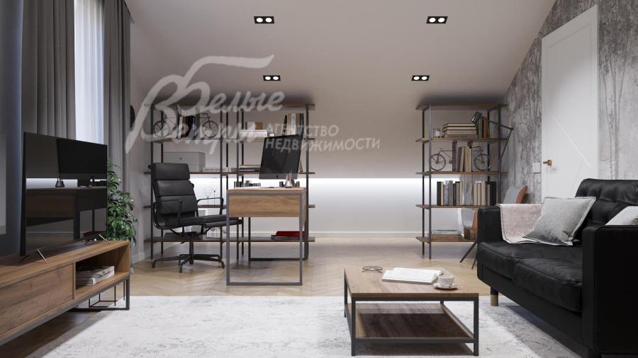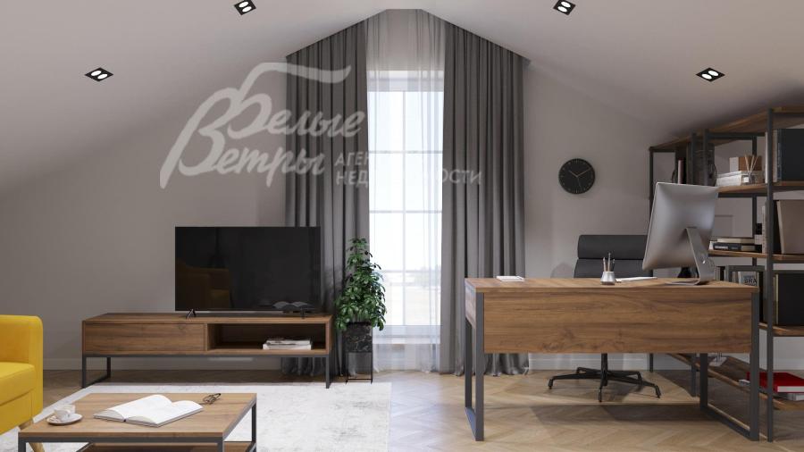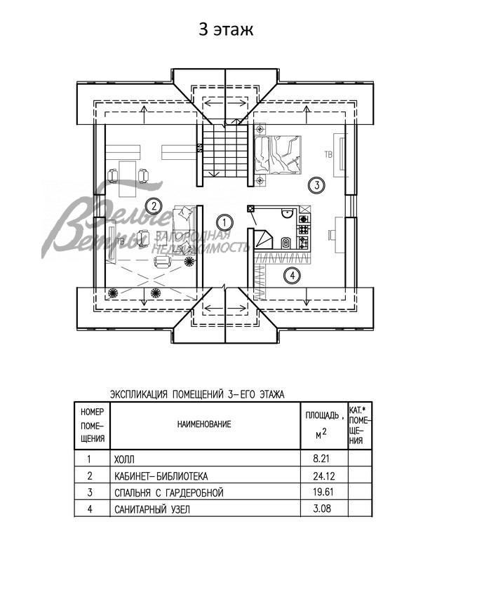 3-ий этаж: мансардный этаж: холл 8 кв.м, кабинет-библиотека 24 кв.м, спальня с гардеробной 19,5 кв.м, санузел с душем 3 кв.м