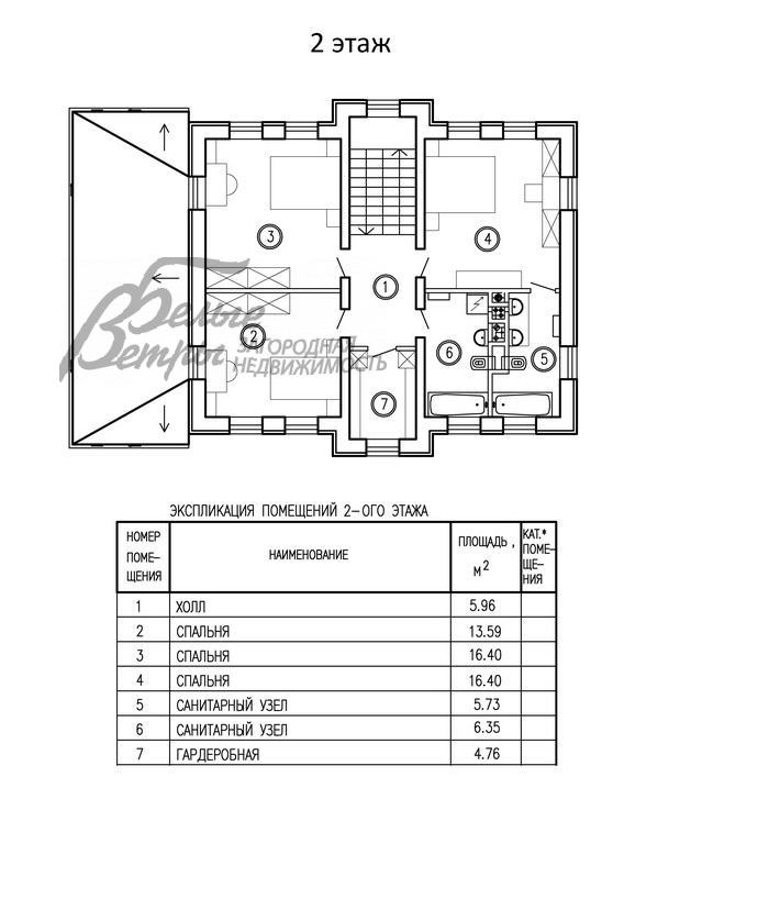 2-ой этаж: холл 6 кв.м, главная спальня 16,5 кв.м с санузлом с ванной 6 кв.м, спальня 16,5 кв.м, спальня 13,5 кв.м, санузел с ванной 6,5 кв.м, гардеробная 5 кв.м
