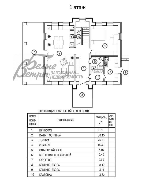 1-ый этаж: крыльцо 8,5 кв.м, прихожая 10 кв.м с гардеробной 3 кв.м, кухня-гостиная 30,5 кв.м с выходом на террасу 26 кв.м, спальня 16,5 кв.м, санузел с душем 3 кв.м, кладовая 4 кв.м, котельная с прачечной 6,5 кв.м с отдельным входом с крыльцом 3 кв.м