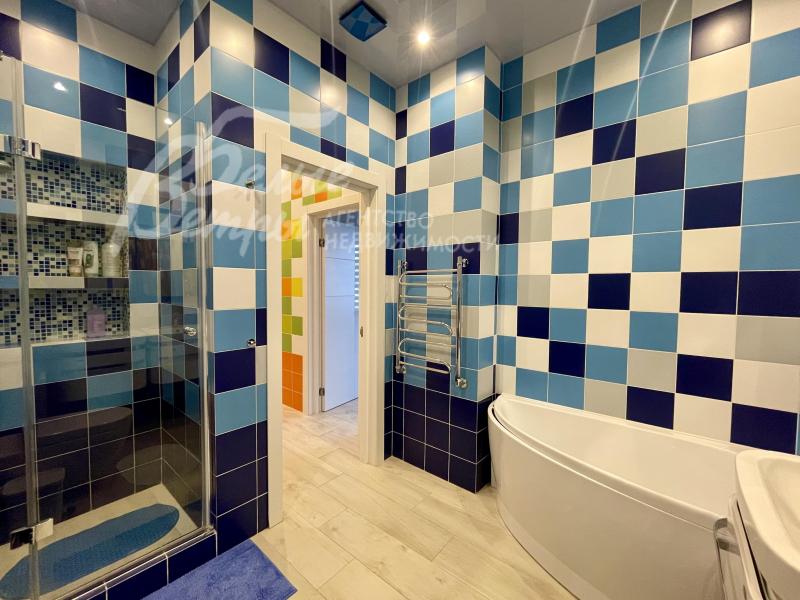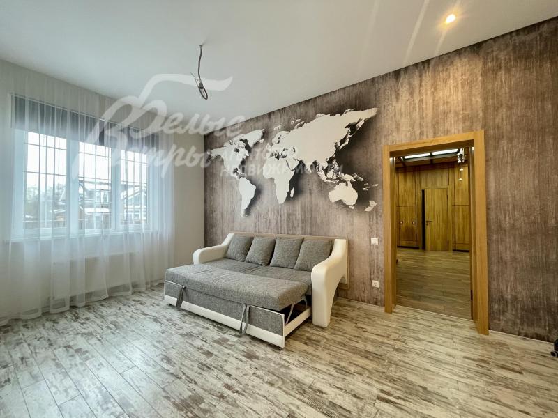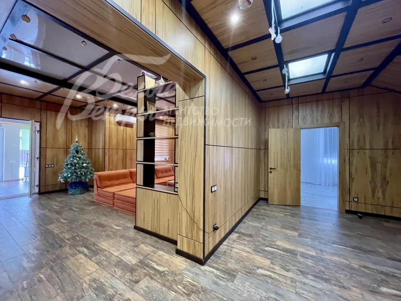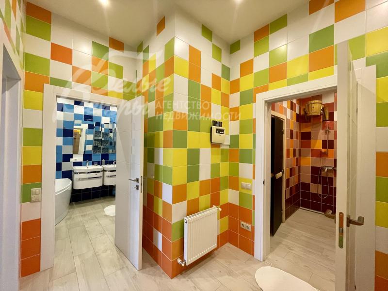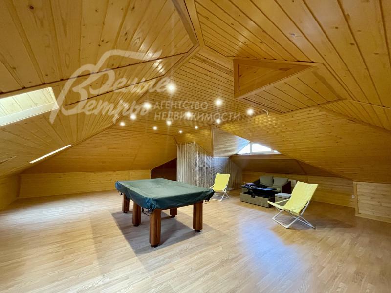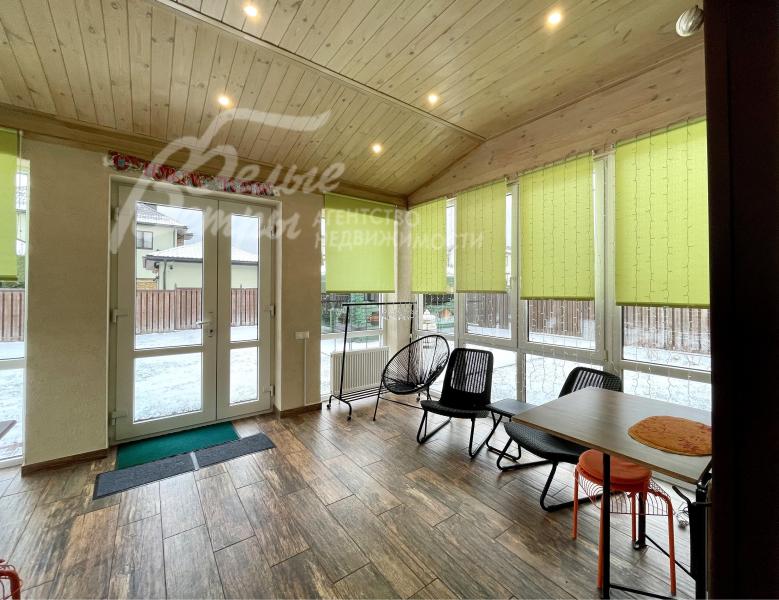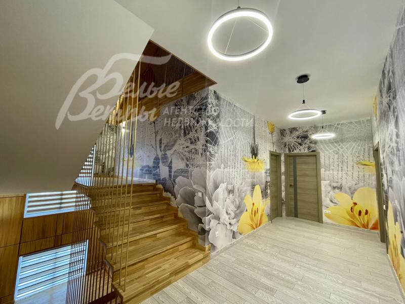 Описание внутренней отделки: выполнена стильная современная отделка, присутствуют элементы стилей фьюжн и эко. Стены общих помещений отделаны панелями из натурального шпона ясеня, в таком же стиле - межкомнатные двери; в санузлах - плитка, в спальнях - обои, а также фотообои. На 1-ом этаже, веранде и в санузлах - полы из керамогранита с водяным подогревом; на 2-ом этаже - паркетная доска. В гостиной - камин, отделанный натуральным камнем и гранитом. Установлена качественная сантехника. Мансардный этаж отделан доской, на полу паркетная доска. Потолок в гостиной подвесной со встроенными лампочками, и панелями из оргстекла со встроенным светом. Двери на 2-ом этаже ламинированные в едином стиле.