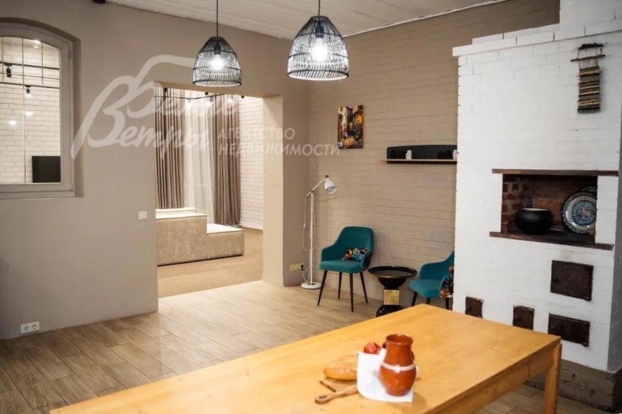 Описание внутренней отделки: дизайнерская эклектика в интерьере: совмещение элементов стилей - лофт (стены), фахверк (отделка потолков), кантри (Русская печь в кухне), модерн (окна). На полу в гостиной и в некоторых спальнях - ковровое покрытие, в мастер-спальне - паркетная доска. В санузлах - коллекционная плитка, в столовой - также плитка, в этих помещениях пол с водяным подогревом. Стены окрашены, в гостиной и кухне - окрашенные стены из кирпича, в некоторых спальнях - комбинированные. Потолки - гипсокартон; в жилых комнатах 2-го этажа - имитация деревянных балок на потолке с эффектной подсветкой.