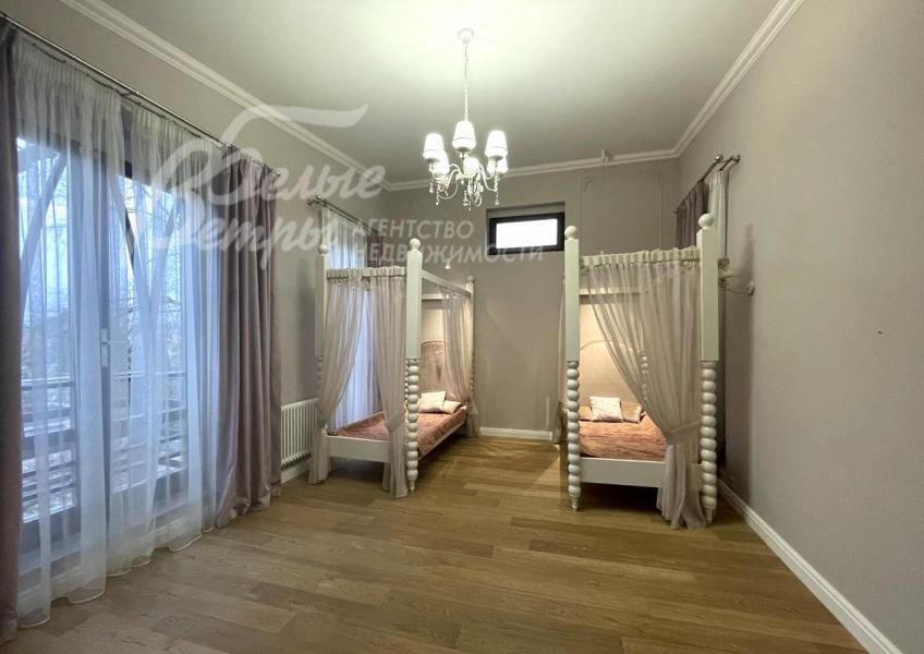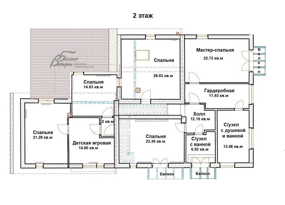 2-ой этаж: спальня 14.6 кв.м, игровая 14.6 кв.м, спальня 21 кв.м, мастер- спальня 23 кв.м с ванной и душевой 13.5 кв.м и гардеробной 12 кв.м, детская спальня 22 кв.м с балконом, санузел 7 кв.м (с ванной)