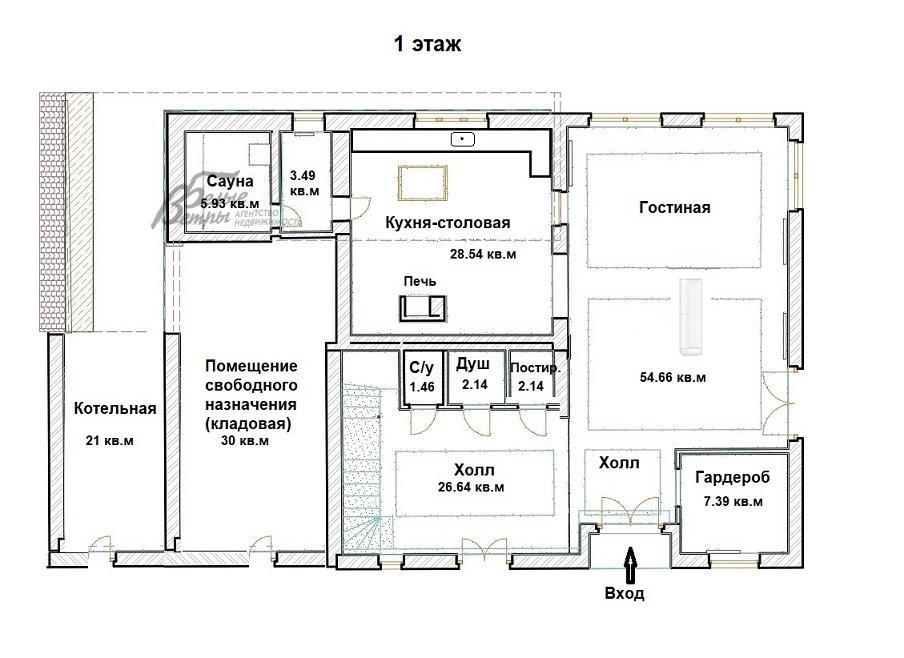 1-ый этаж: прихожая, переходящая в гостиную 54.7 кв.м, гардеробная 7.4 кв.м, кухня-столовая 28.6 кв.м, сауна 6 кв.м с предбанником 3.5 кв.м, холл 26.6 кв.м, туалет 1.4 кв.м, душевая 2 кв.м, постирочная 2 кв.м