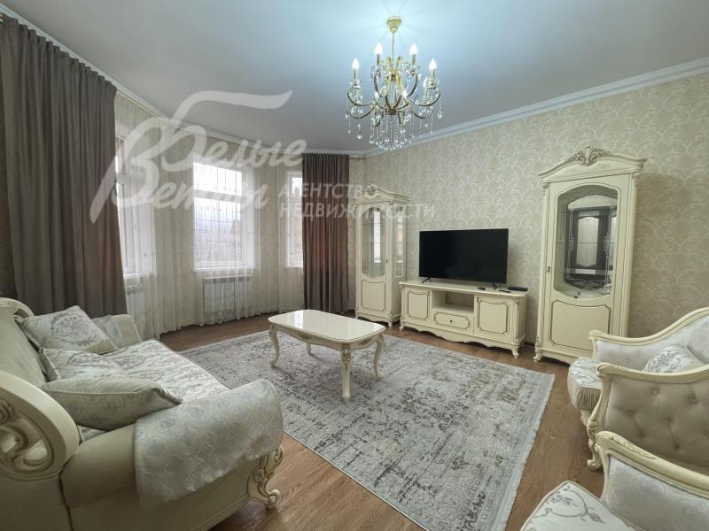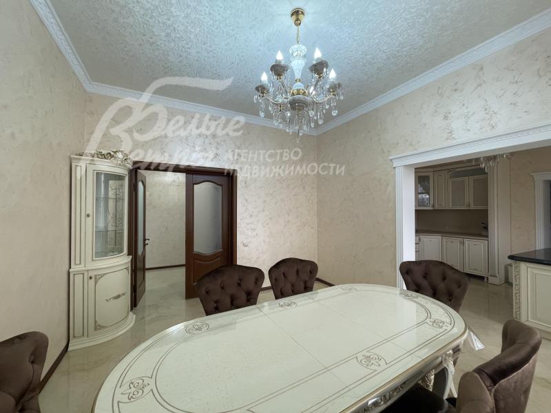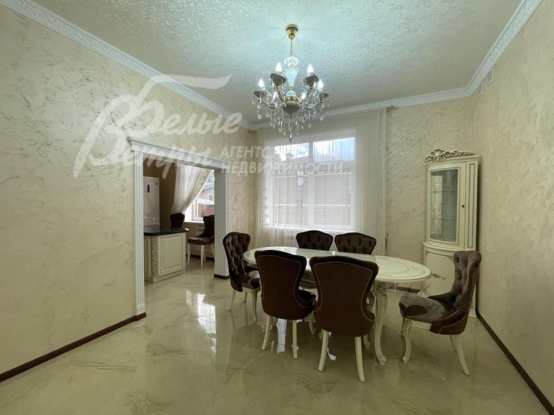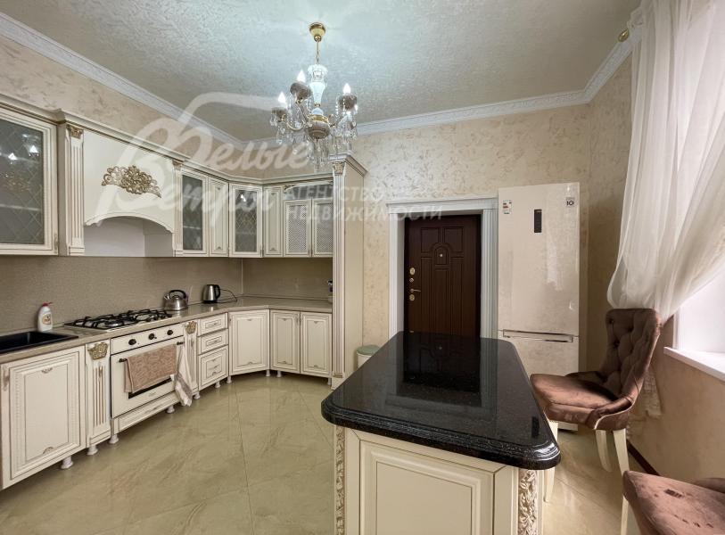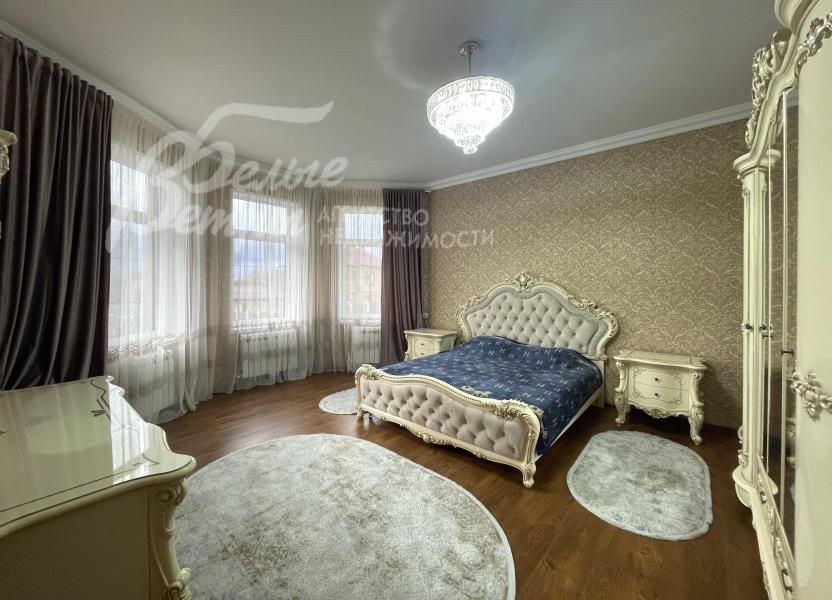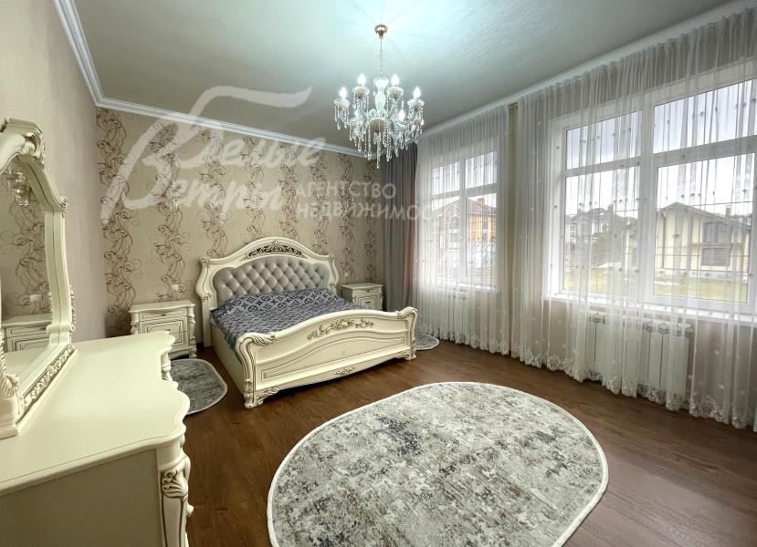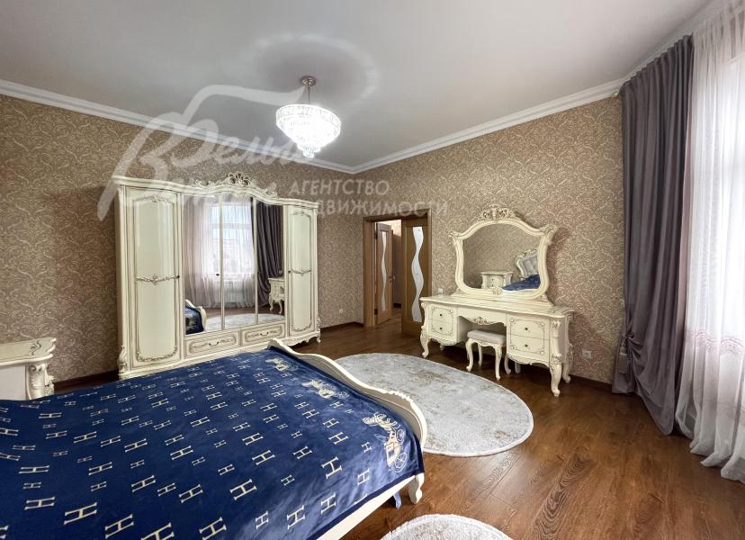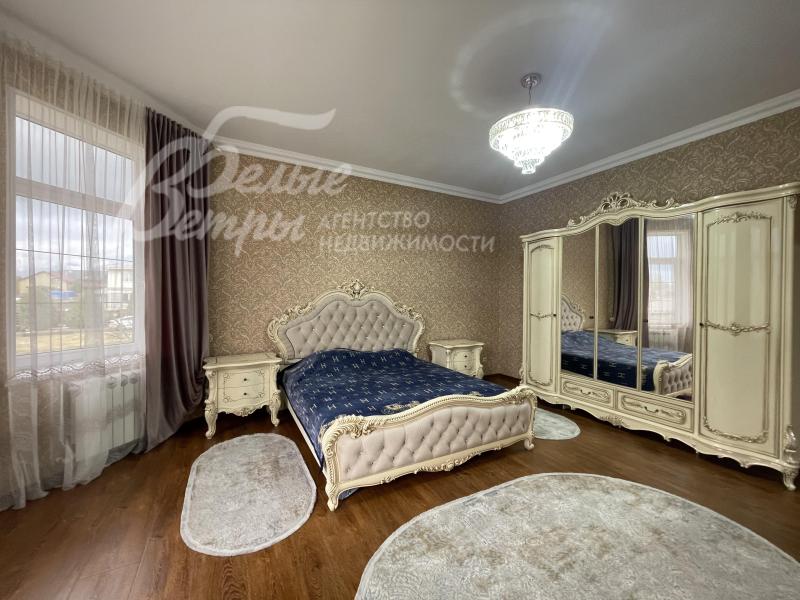 Мебель, оборудование: мебель в кухне, столовой и во всех спальнях - в едином стиле, цвета топленого молока, из резного дерева с "золотым" декором. В кухне-столовой полный большой кухонный гарнитур в классическом стиле с фасадами молочного цвета, с витринами для посуды, с островом и полубарным столом, столешница из камня. Гарнитур со встроенной техникой: варочная панель, электрический духовой шкаф, вытяжка, холодильник. В кухне обеденный стол на 6 персон. В зоне столовой-гостиной - обеденная группа на 6 персон (стол с креслами), диван, кресла, журнальный столик, витрины, комод с зеркалом. Во второй гостиной - диван, кресла, шкафы-витрины, тумба, телевизор. В спальнях полные гарнитуры: большие кровати, комоды, трюмо, шкафы с зеркалами. В гостевой спальне над гаражом - большая кровать, тумбы, комод.