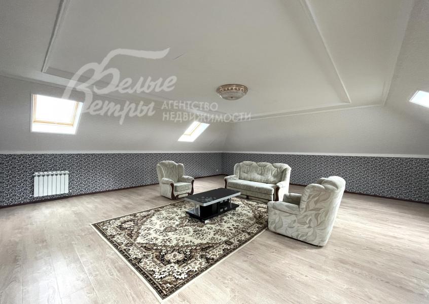 В мансардной комнате диван, два кресла и журнальный стол. Во всех помещениях: карнизы, занавески, шторы, тюль, ковры, хрустальные люстры, светильники.