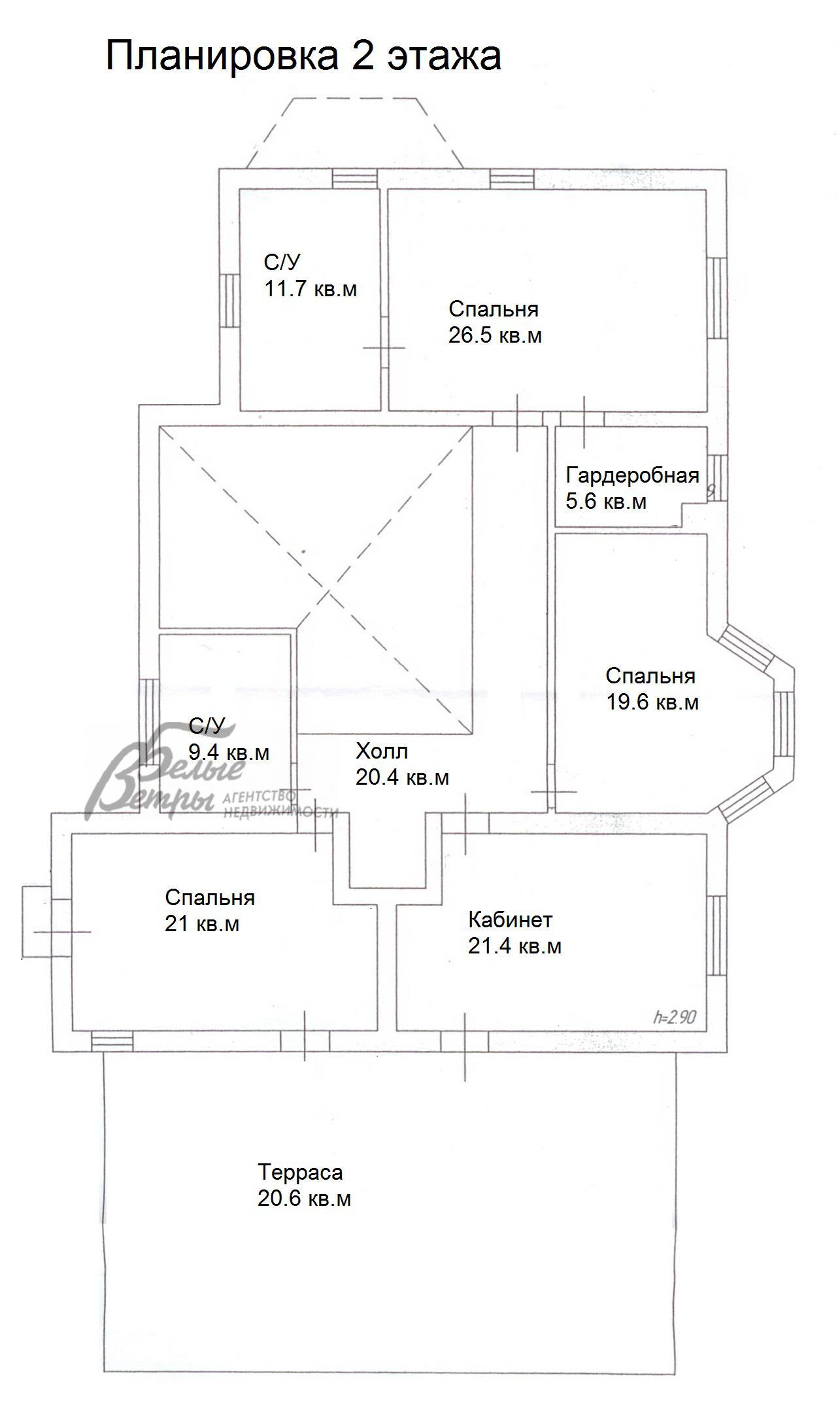 2-ой этаж: спальня с санузлом и гардеробной 47 кв.м, спальня с выходом на террасу 21 кв.м, детская 20 кв.м, санузел 9.5 кв.м, кабинет с выходом на террасу 21.5 кв.м