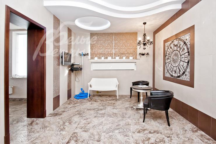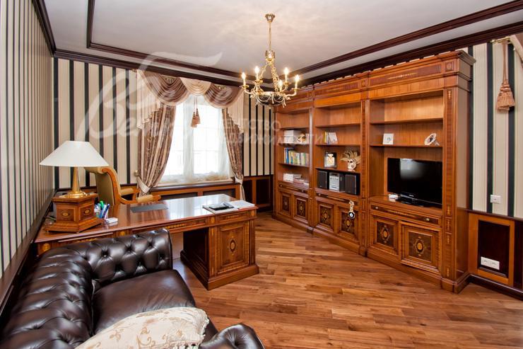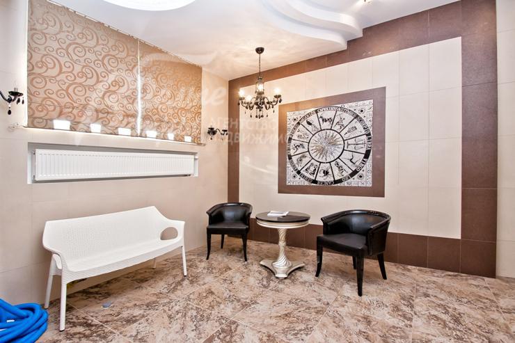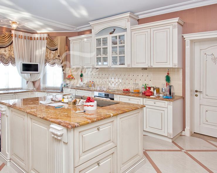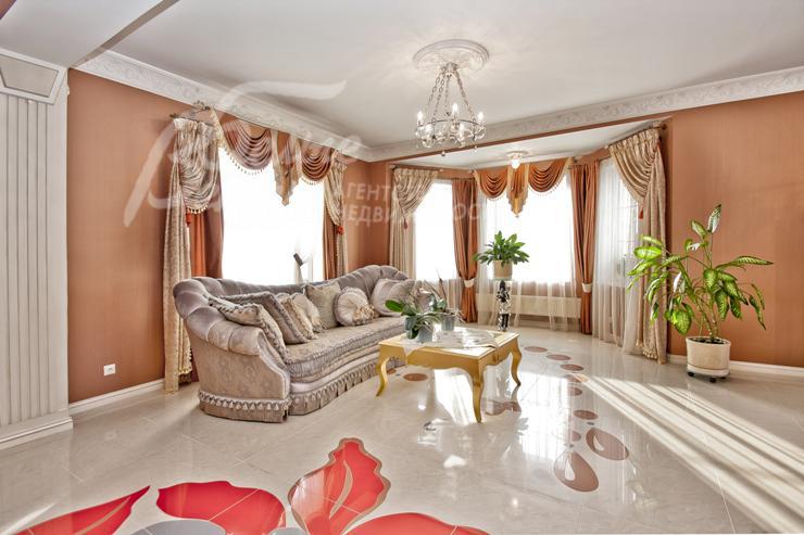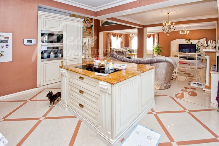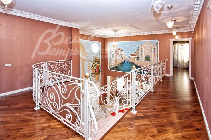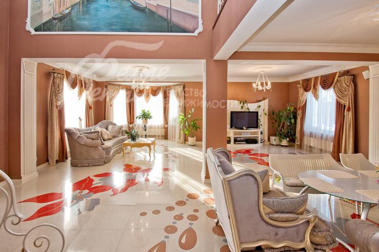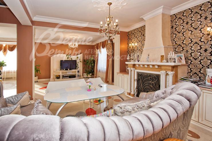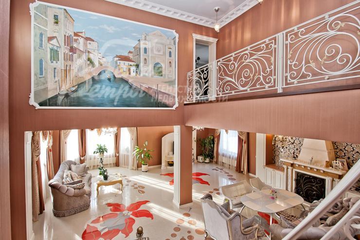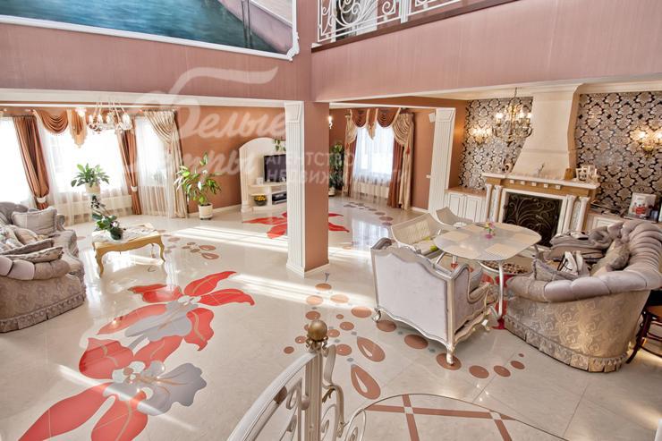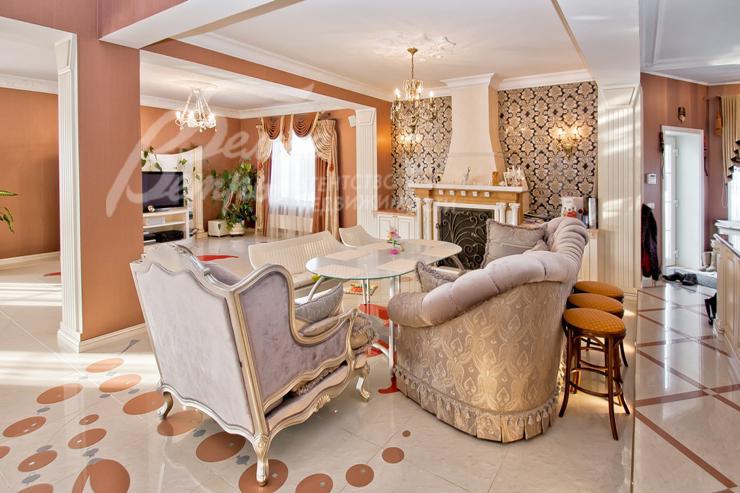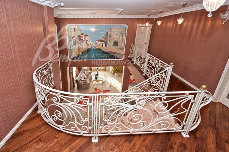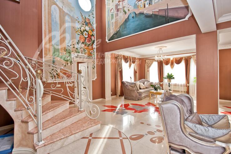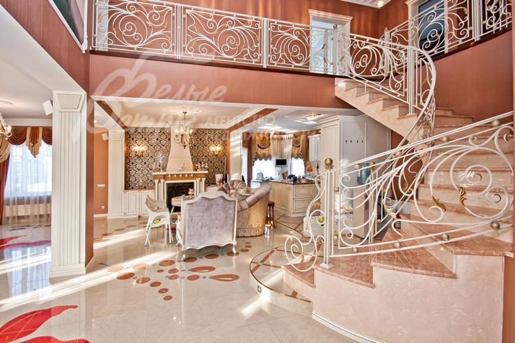 Описание внутренней отделки: выполнена дизайнерская отделка в стиле ар-деко: венецианская штукатурка, обои, гобелен, лепнина. Лестница монолитная, отделанная мрамором с изящными коваными перилами. Столешница и подоконники кухни - мрамор.
