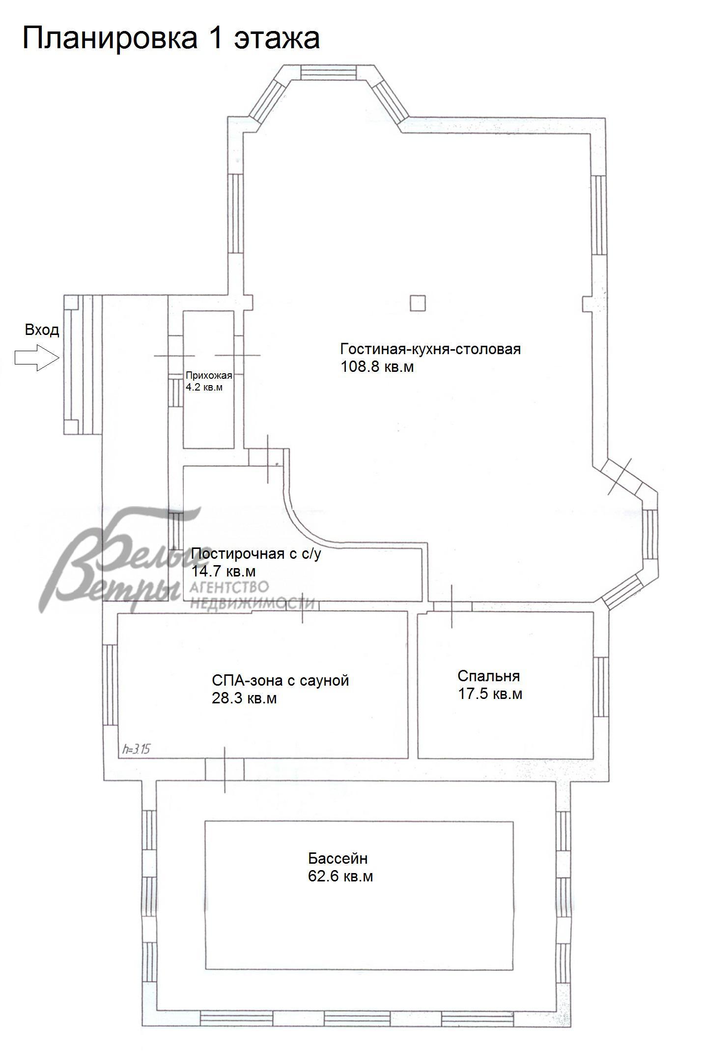 1-ый этаж: гостиная 108 кв.м совмещена с кухней-столовой, гостевая комната 17.5 кв.м, бассейн 63 кв.м, чаша 28 кв.м, зона СПА с сауной 28 кв.м, прихожая 4.2 кв.м, постирочная с санузлом 15 кв.м