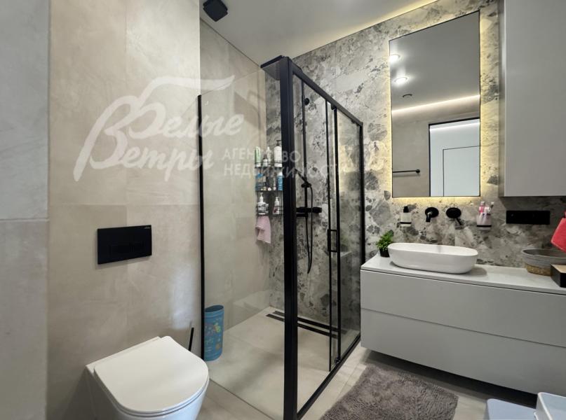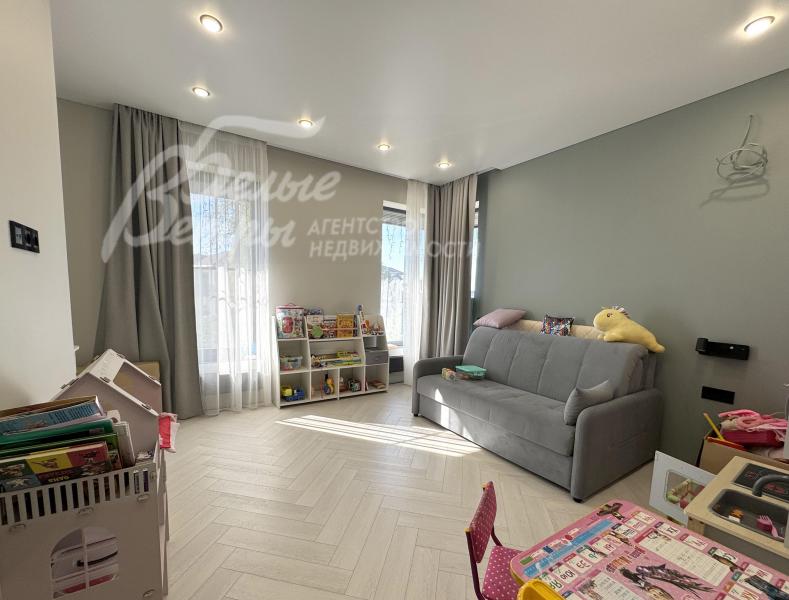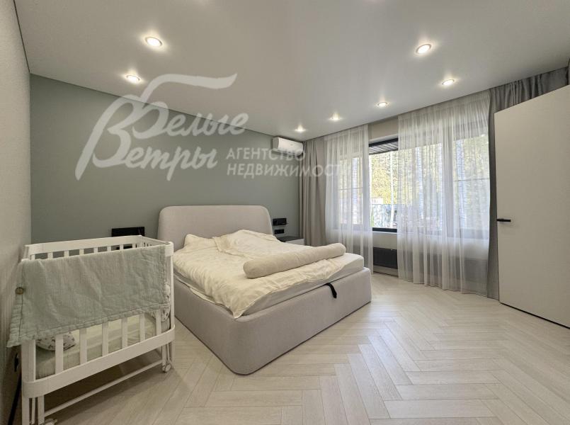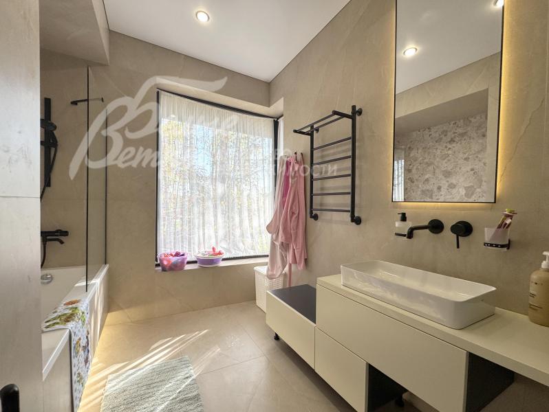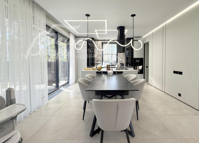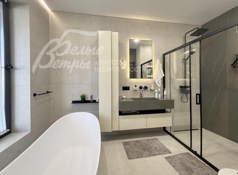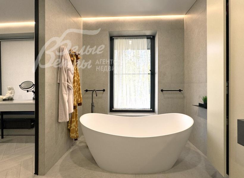 Мебель, оборудование: дом полностью меблирован и оснащён техникой. На кухне – гарнитур в трендовом цветовом решении с островом («Стильные Кухни»), столовая группа, техника: духовой шкаф, микроволновая печь, варочная плита, посудомоечная машина, встроенный холодильник Gorenje. В гостиной – большой диван, в спальнях – спальные гарнитуры, телевизоры, системы хранения в гардеробных. Есть стиральная и сушильная машины. В санузлах – встроенные душевые уголки, раковины, водяные полотенцесушители, безободковые унитазы, мебель, выполненная на заказ, в санузле мастер-спальни – отдельностоящая ванна из литьевого мрамора