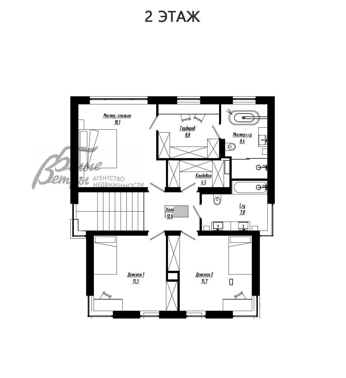 2-ой этаж: холл 12,5 кв.м, мастер-спальня 18 кв.м с гардеробной 9 кв.м и санузлом с ванной и душевой 8,5 кв., спальня 16 кв.м, спальня 15,5 кв.м, санузел с ванной 8 кв.м, гардеробная 4,5 кв.м