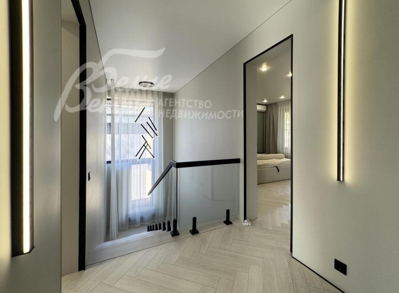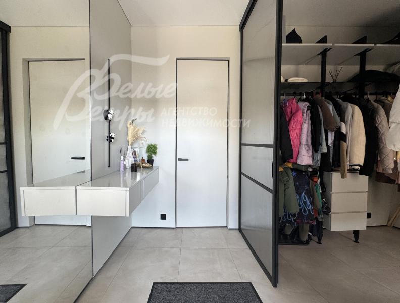 Описание внутренней отделки: интерьер оформлен в стиле минимализма – в цветовой гамме доминируют светлые холодные тона. Отделка стен включает трёхслойную шпатлёвку, армирующий стеклохолст и финишное покрытие моющейся краской Dulux Bindo 7, стены санузлов оформлены керамогранитом – стильно скомбинированы варианты современных дизайнеров. На полу – керамогранит Италон и кварцвинил НоmеЕхреrt. Потолок – натяжной, со световыми линиями и скрытым карнизом: реализовано несколько сценариев освещения; на кухне – люстра, есть бра с беспроводной зарядкой. Установлены стальные панельные радиаторы Кеrmi, проходные выключатели со стеклянной рамкой, автоматическое управление шторами, межкомнатные двери скрытого монтажа, входная дверь из тёплого алюминия со стеклопакетом черного цвета и электронным замком "hottel slim" (вход – по отпечатку пальца, интегрирован с «Умным домом»). На второй этаж ведёт монолитная лестница со ступенями, отделанными деревом, и ограждением из закаленного стекла. На полу всего 1-го этажа и в санузлах 2-го этажа – тёплые полы. Выполнено фасадное освещение дома