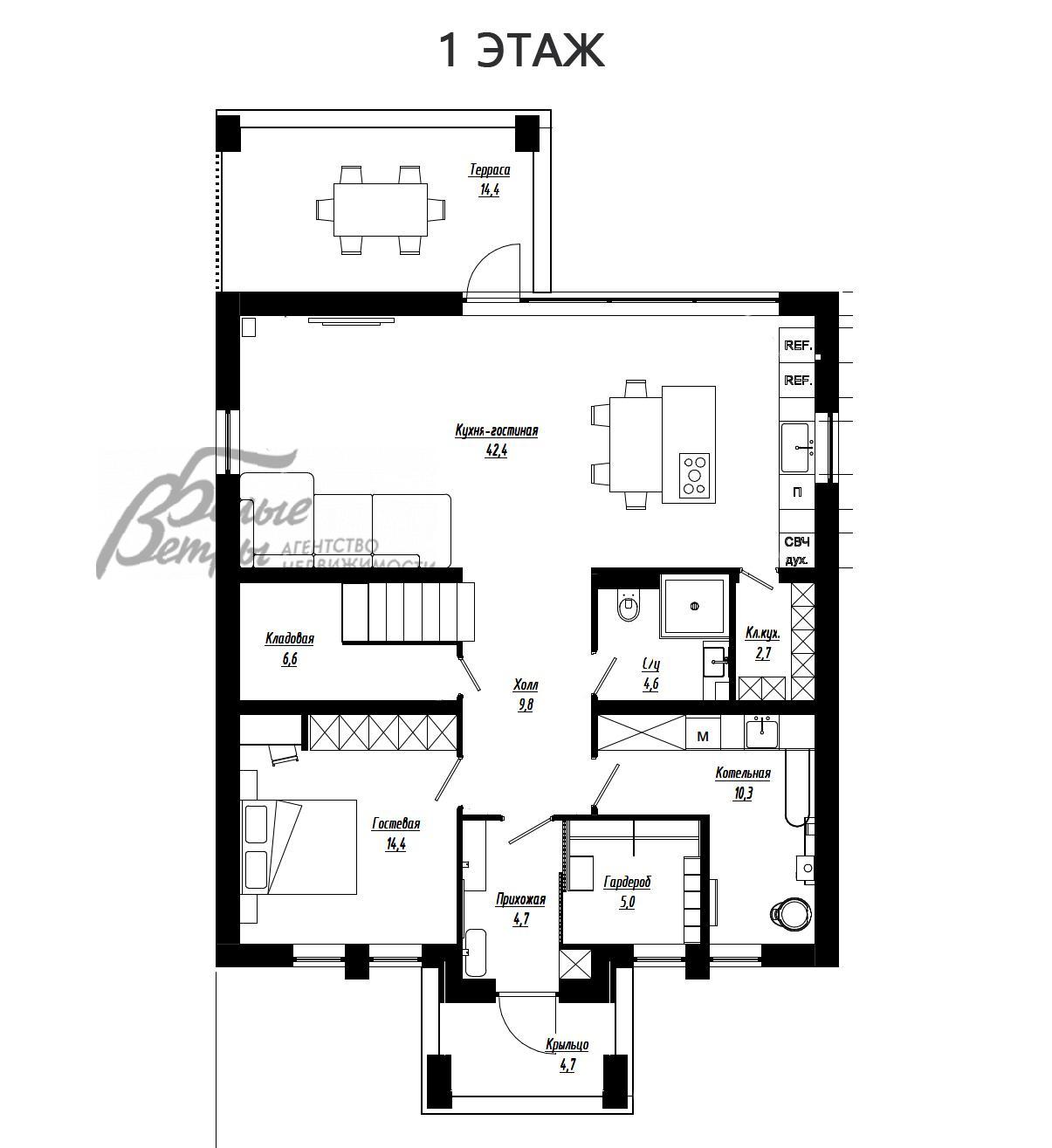 1-ый этаж: крытое крыльцо 4,5 кв.м, прихожая 4,5 кв.м, гардеробная 5 кв.м, холл 10 кв.м, кухня-столовая-гостиная 42 кв.м с выходом на крытую террасу 14,5 кв.м, кладовая при кухне 23 кв.м, спальня 14,5 кв.м, санузел с душевой 6,5 кв.м, котельная 10 кв.м, кладовая (под лестницей) 6,5 кв.м