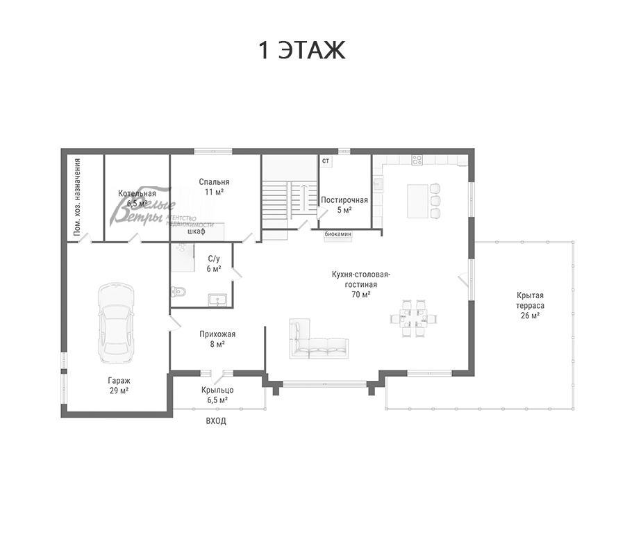 1-ый этаж: крыльцо 6,5 кв.м, прихожая 8 кв.м, кухня-столовая-гостиная 70 кв.м с выходов на террасу 26 кв.м, спальня 11 кв.м, санузел с душевой 6 кв.м, постирочная 5 кв.м, гараж 29 кв.м, котельная 6,5 кв.м, хозяйственное помещение